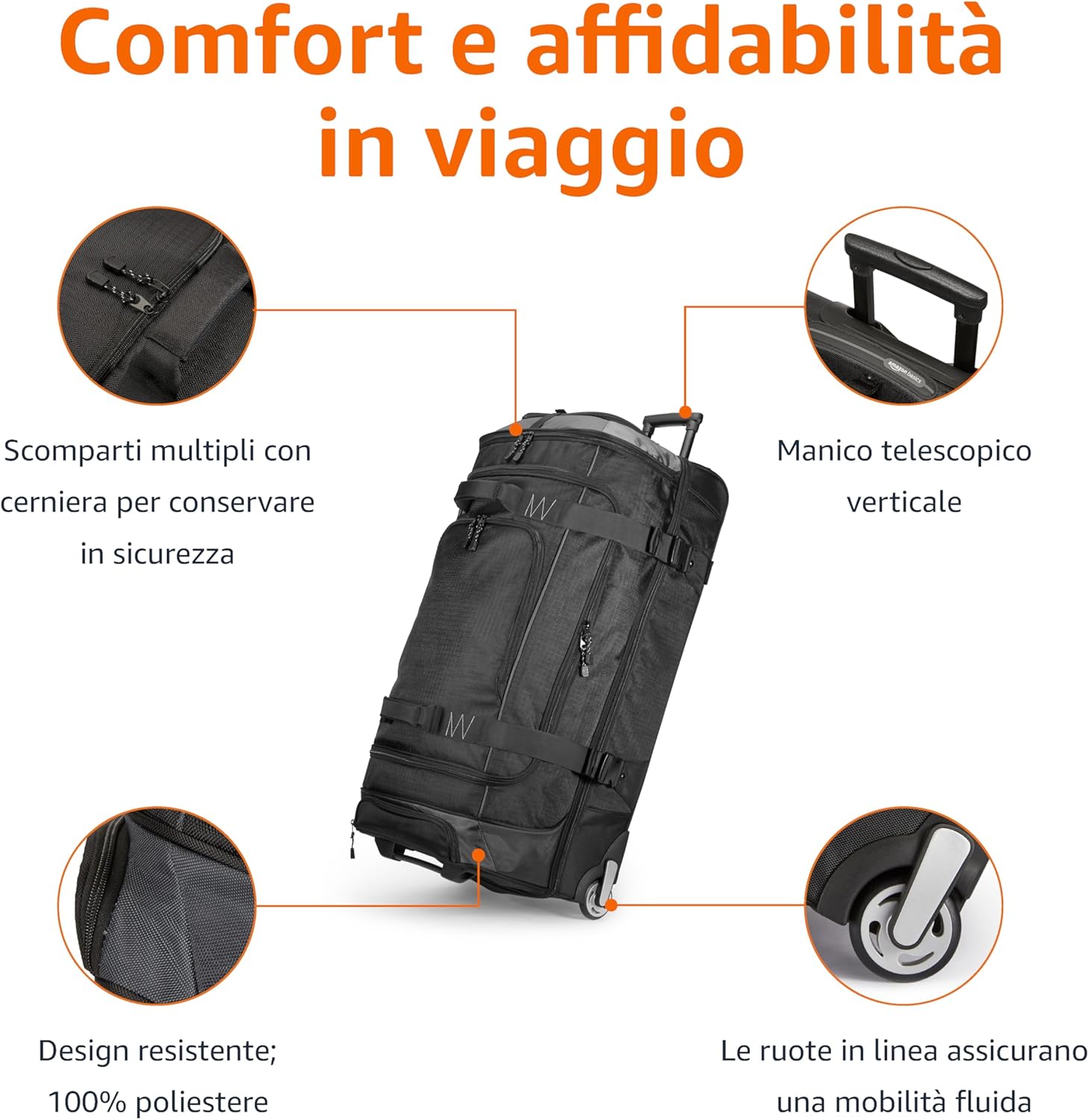 Amazon Basics – Borsone da viaggio con ruote, nero, 30″
