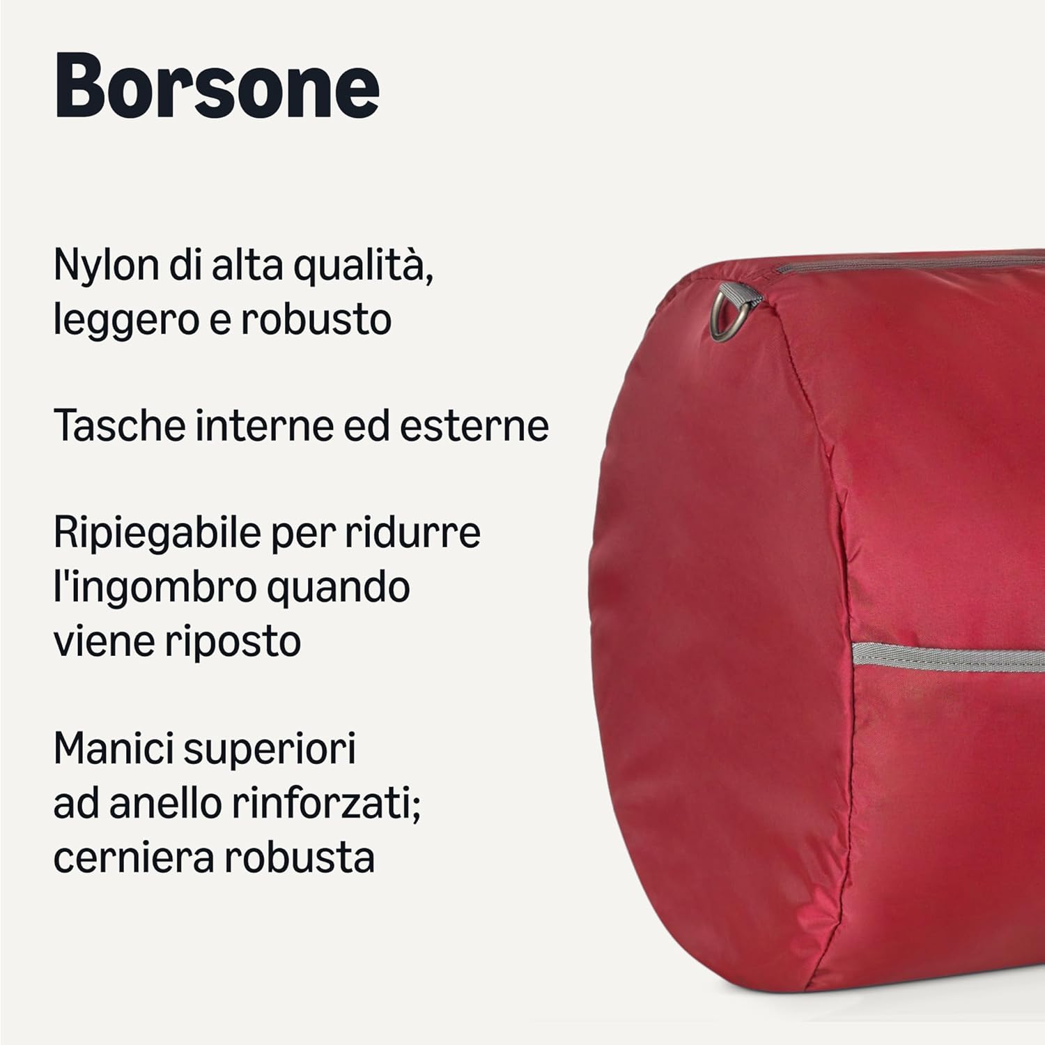 Borsone extra large Amazon Essentials progettato per essere leggero e pieghevole. Realizzato in nylon resistente e dotato di tasche con cerniera. Adatto per il viaggio, lo stoccaggio o come borsone di riserva.