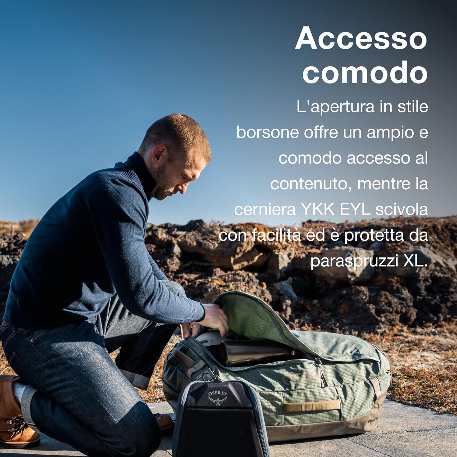 L’apertura in stile borsone offre un accesso ampio e comodo e garantisce la longevità della cerniera. La resistente cerniera YKK di misura 10 scivola con facilità ed è protetta dai paraspruzzi XL.